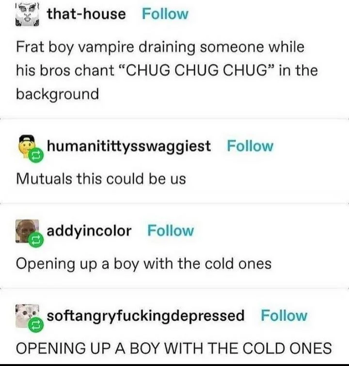 First of all, I can also turn off my emotions, you’re not special. (Okay, they’re kind of always off? and people say it’s not great? but I think I get a lot done, and I’m not being weird, so I’ll keep the alexithymia, okay?) Secondly, can you only do it if you’re eating people on the regs? And how do you fit 6 litres or whatever it is of blood in the human body into your body? Like, how is exsanguinating a person even possible? So you could just bite people, and not actually eat them, so there would be no guilt in the first place, yes?